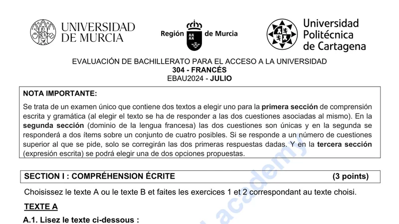 Examen PAU Francés selectividad Murcia — Extraordinaria 2024