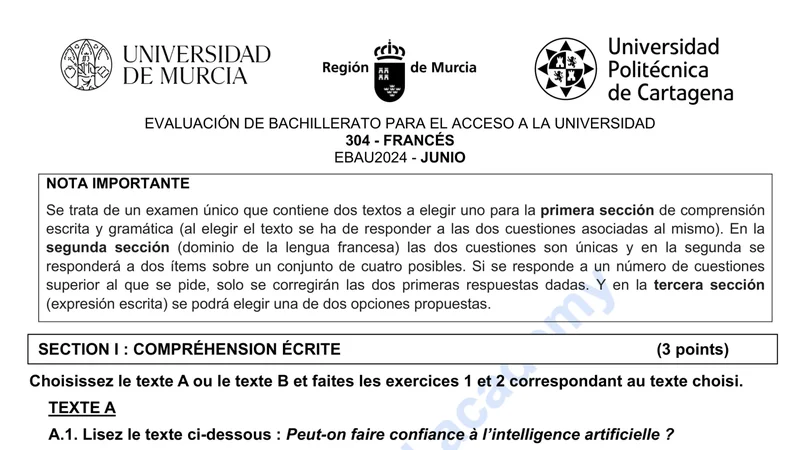 Examen PAU Francés selectividad Murcia — Ordinaria 2024