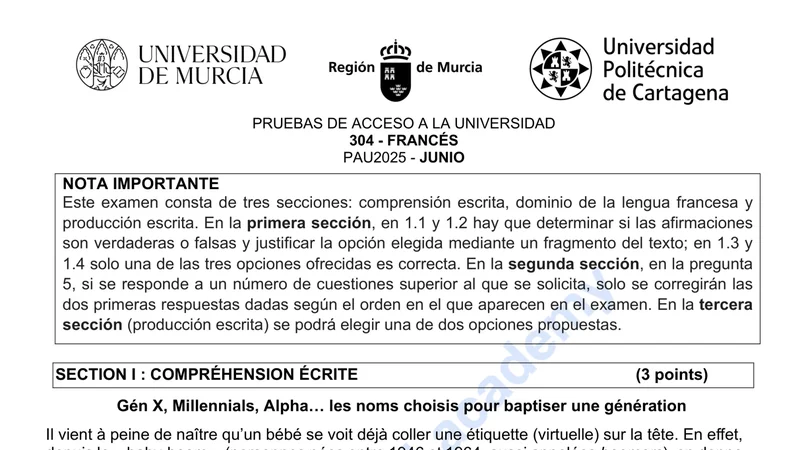 Examen PAU Francés selectividad Murcia — Ordinaria 2025