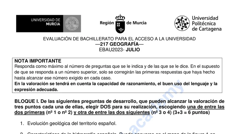 Examen PAU Geografía selectividad Murcia — Ordinaria 2023
