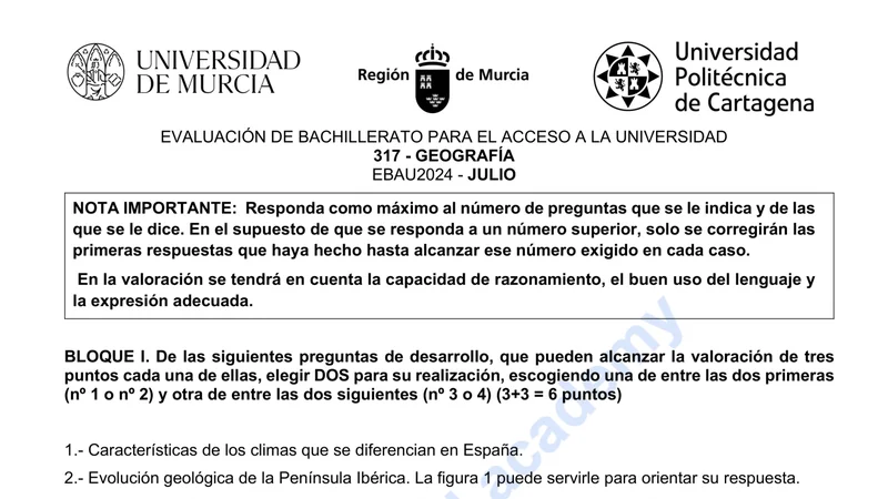 Examen PAU Geografía selectividad Murcia — Extraordinaria 2024