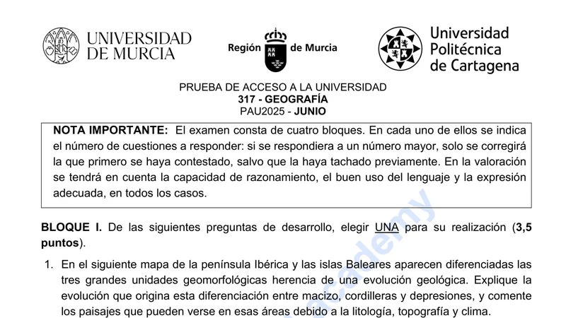 Reservar clase gratis →Examen de Geografía selectividad Murcia (Ordinaria 2025)