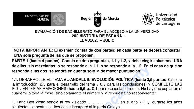 Reservar clase gratis →Examen de Historia de España selectividad Murcia (Extraordinaria 2023)
