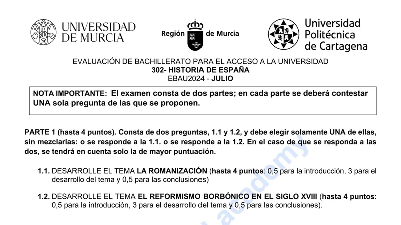 Examen PAU Historia de España selectividad Murcia — Extraordinaria 2024