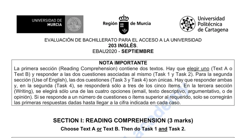 Examen PAU Inglés selectividad Murcia — Extraordinaria 2020