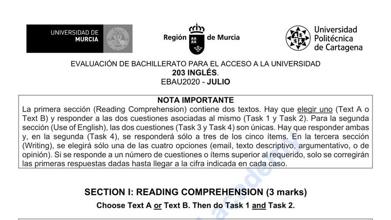 Examen PAU Inglés selectividad Murcia — Ordinaria 2020