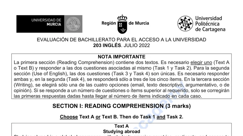 Examen PAU Inglés selectividad Murcia — Extraordinaria 2022