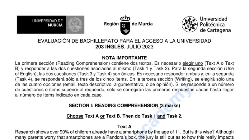 Examen PAU Inglés selectividad Murcia — Extraordinaria 2023