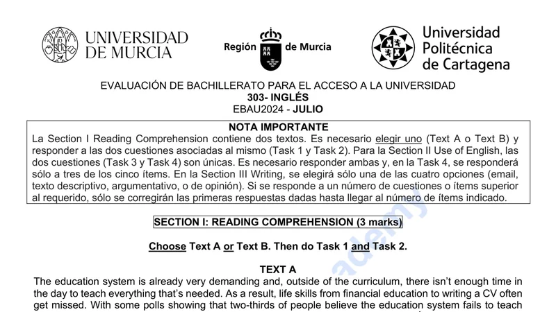 Examen PAU Inglés selectividad Murcia — Extraordinaria 2024