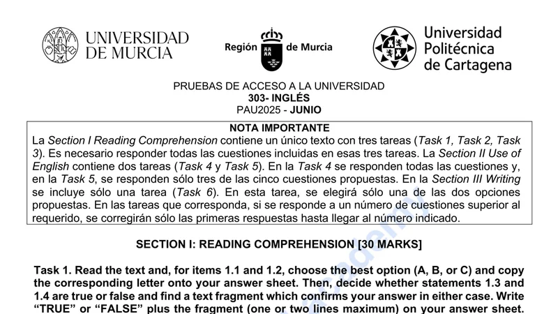Examen PAU Inglés selectividad Murcia — Ordinaria 2025