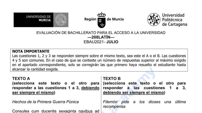 Examen PAU Latín II selectividad Murcia — Extraordinaria 2021
