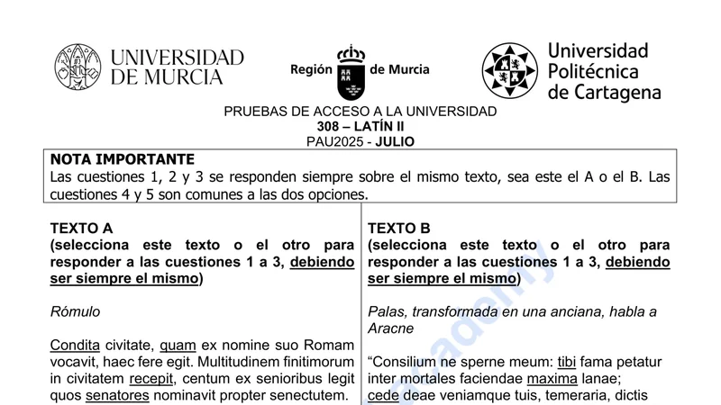 Examen PAU Latín II selectividad Murcia — Extraordinaria 2025