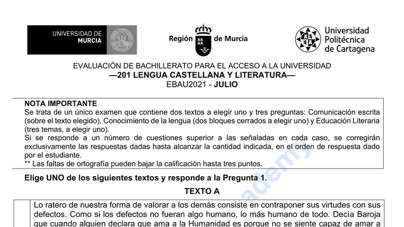 Examen PAU Lengua Castellana selectividad Murcia — Extraordinaria 2021