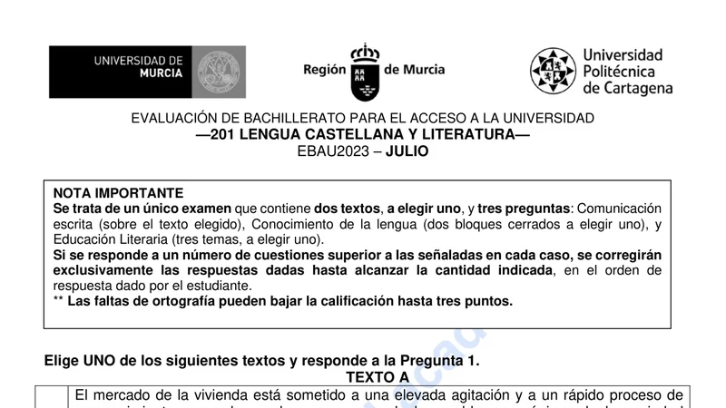 Examen PAU Lengua Castellana selectividad Murcia — Ordinaria 2023