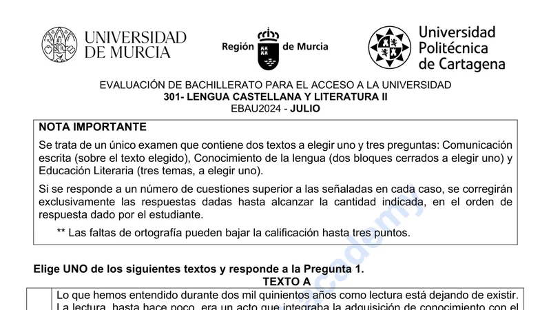 Examen PAU Lengua Castellana selectividad Murcia — Extraordinaria 2024
