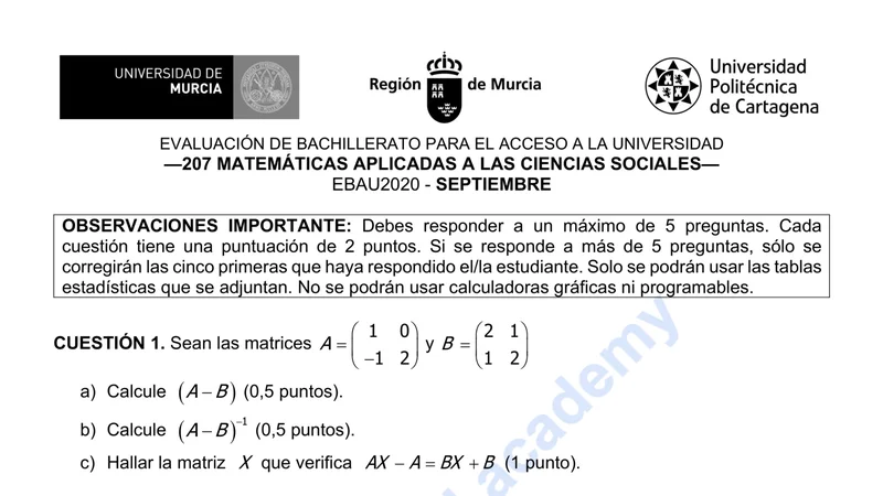 Examen PAU Matemáticas CCSS selectividad Murcia — Ordinaria 2020