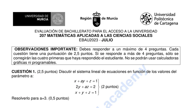 Examen PAU Matemáticas CCSS selectividad Murcia — Ordinaria 2023