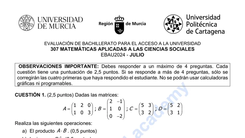 Examen PAU Matemáticas CCSS selectividad Murcia — Extraordinaria 2024