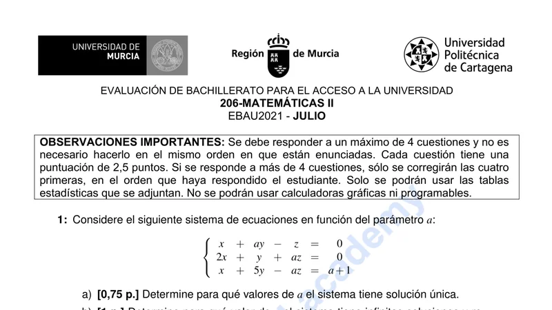Enunciado oficial del examen de Matemáticas II de la convocatoria ordinaria de 2021 de la EBAU/PAU de Murcia. PDF de 0.3 MB. Descarga gratuita y sin registro. ¿Preparando la selectividad? Calcula tu nota estimada o consulta la guía completa de selectividad 2026. Encuentra todos los exámenes de Matemáticas II en Murcia o explora las 17 comunidades autónomas.