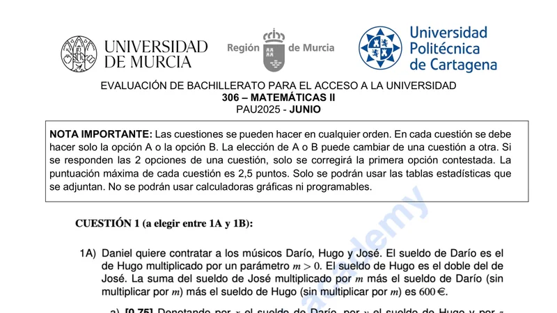 Reservar clase gratis →Examen de Matemáticas II selectividad Murcia (Ordinaria 2025)