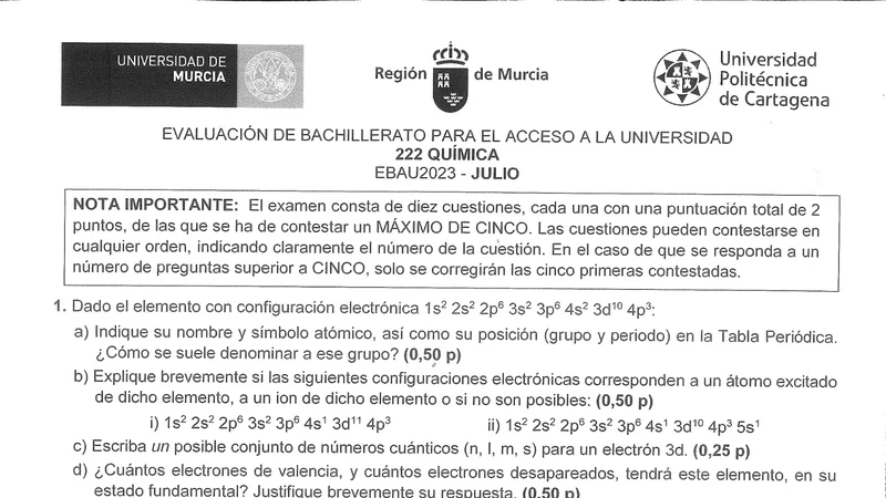Examen PAU Química selectividad Murcia — Ordinaria 2023
