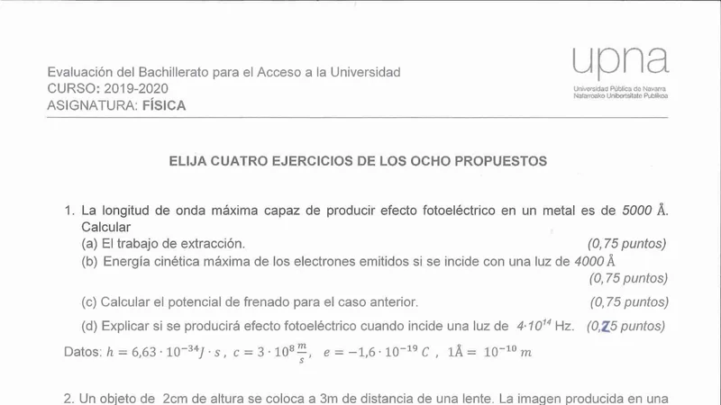 Examen PAU Física selectividad Navarra — Ordinaria 2020
