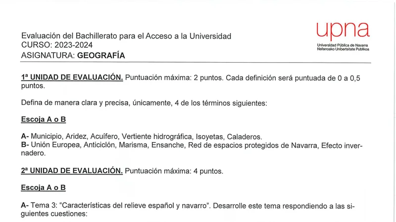 Examen PAU Geografía selectividad Navarra — Ordinaria 2024