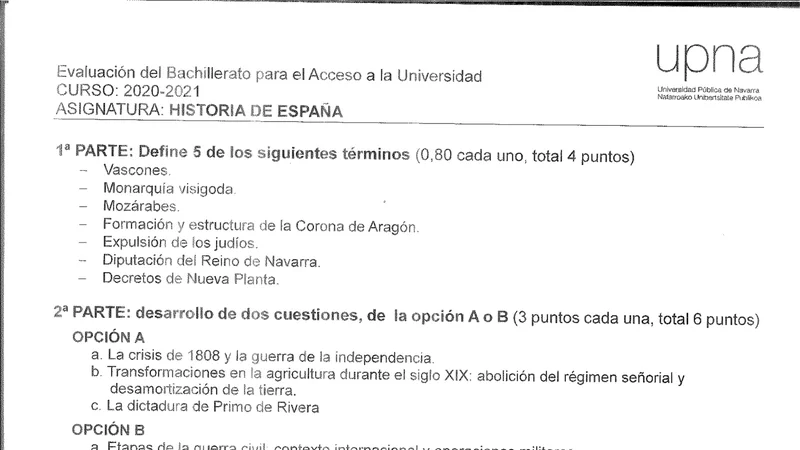 Examen de Historia de España selectividad Navarra — Extraordinaria 2021