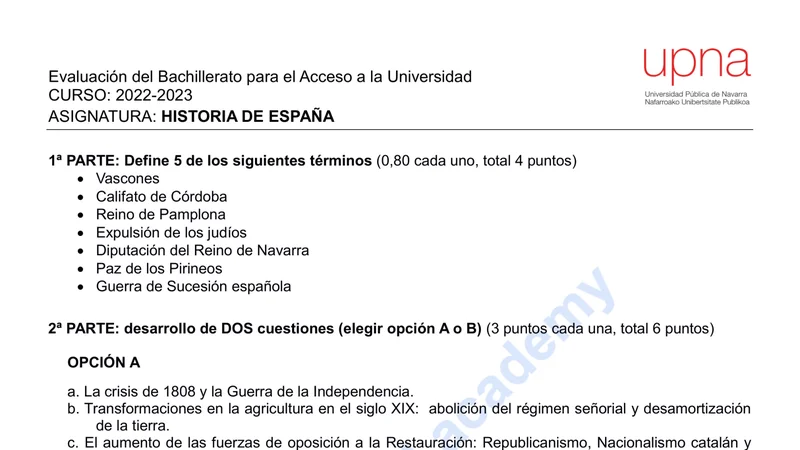 Examen de Historia de España selectividad Navarra — Ordinaria 2023