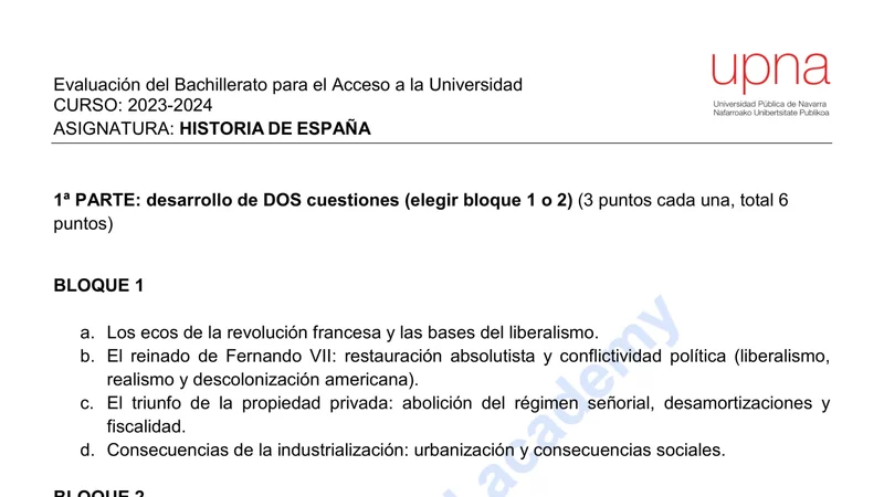 Reservar clase gratis →Examen de Historia de España selectividad Navarra (Extraordinaria 2024)
