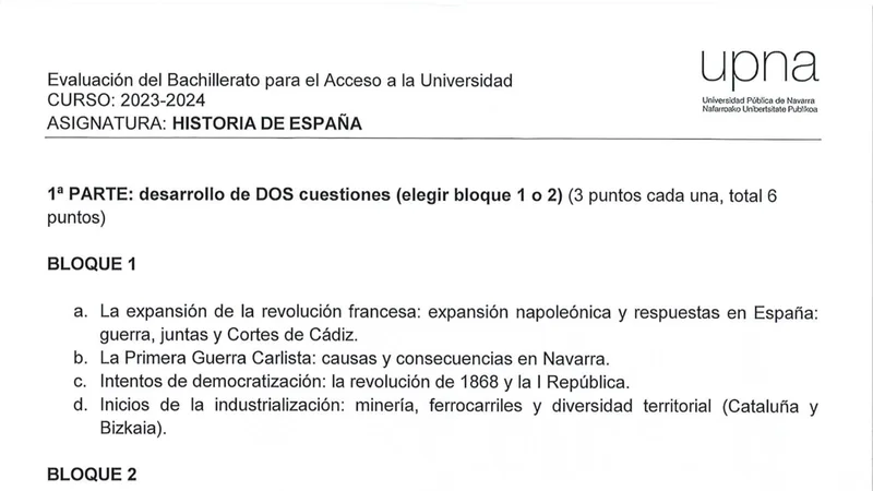 Examen de Historia de España selectividad Navarra — Ordinaria 2024