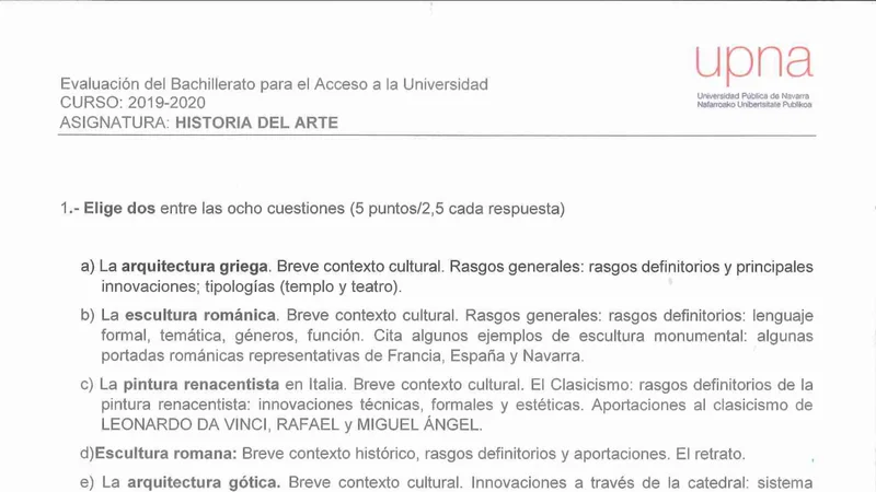 Examen PAU Historia del Arte selectividad Navarra — Extraordinaria 2020