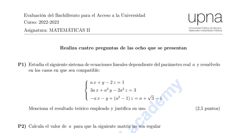 Reservar clase gratis →Examen de Matemáticas II selectividad Navarra (Extraordinaria 2023)
