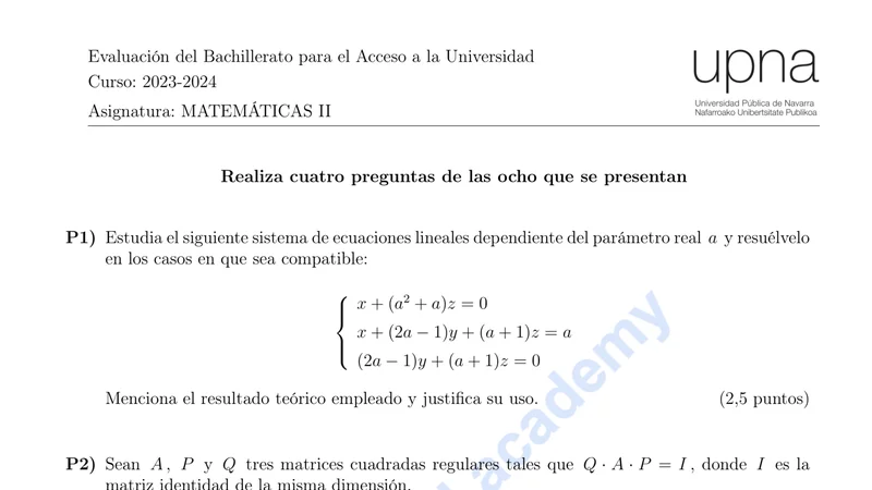 Reservar clase gratis →Examen de Matemáticas II selectividad Navarra (Extraordinaria 2024)