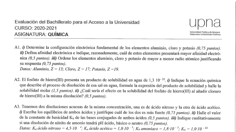 Examen PAU Química selectividad Navarra — Extraordinaria 2021