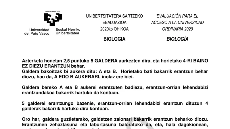 Examen PAU Biología selectividad País Vasco — Ordinaria 2020