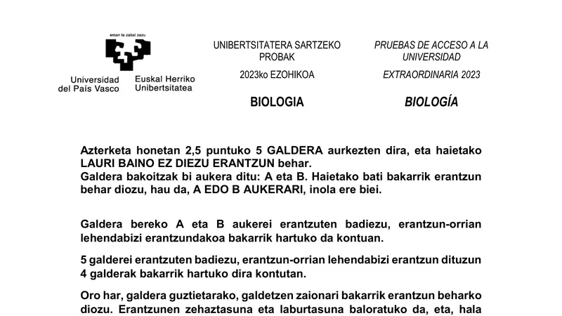 Examen PAU Biología selectividad País Vasco — Extraordinaria 2023