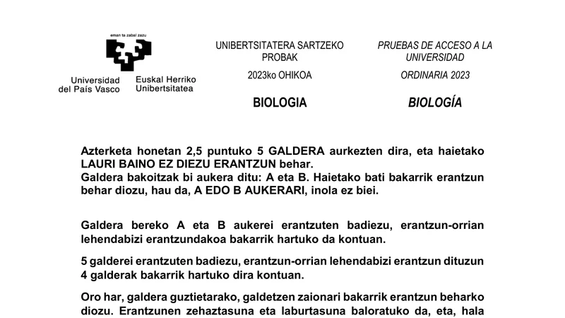 Examen PAU Biología selectividad País Vasco — Ordinaria 2023
