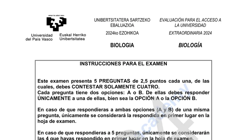 Examen PAU Biología selectividad País Vasco — Extraordinaria 2024