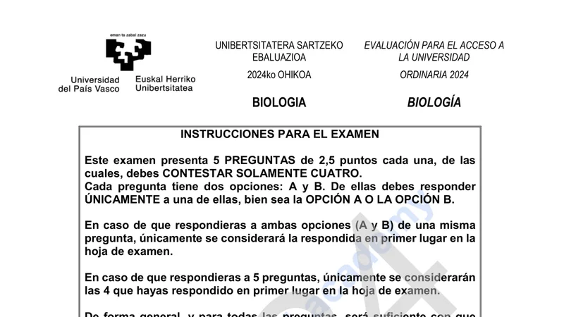 Examen PAU Biología selectividad País Vasco — Ordinaria 2024
