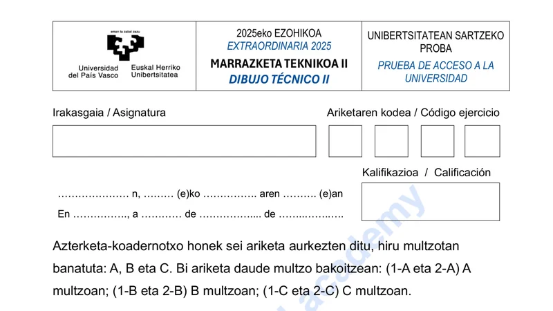 Reservar clase gratis →Examen de Dibujo Técnico II selectividad País Vasco (Extraordinaria 2025)