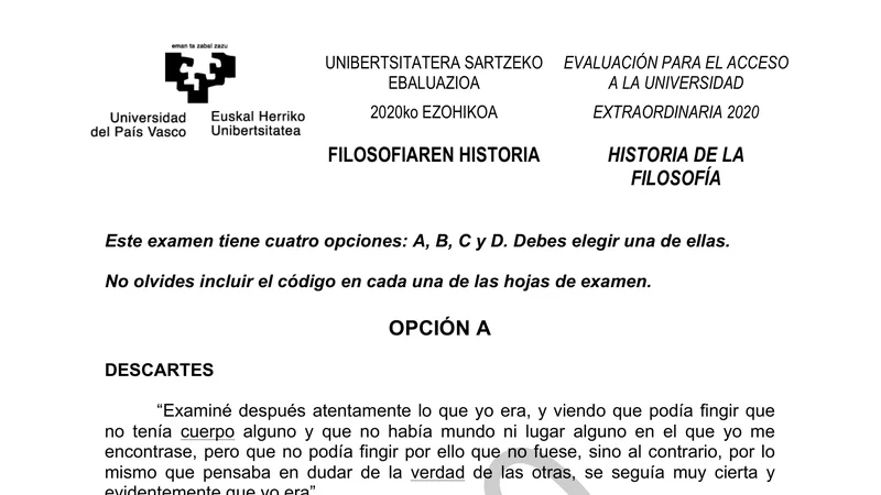 Examen de Historia de la Filosofía selectividad País VascoExtraordinaria 2020