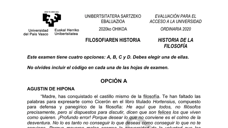Examen de Historia de la Filosofía selectividad País Vasco — Ordinaria 2020