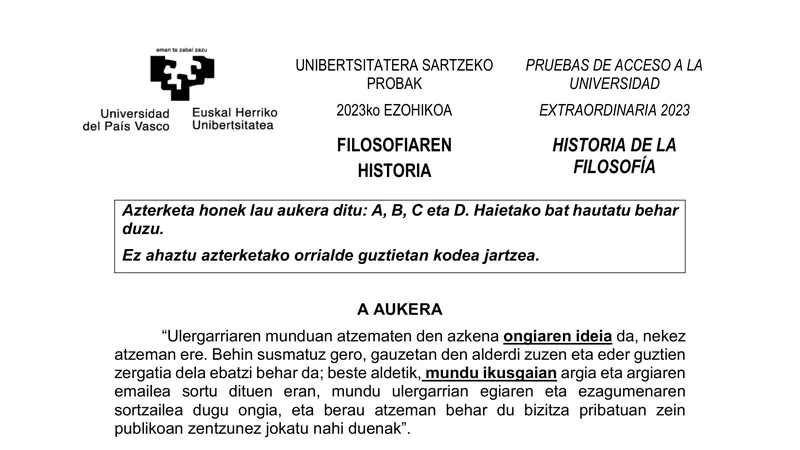 Examen de Historia de la Filosofía selectividad País Vasco — Extraordinaria 2023