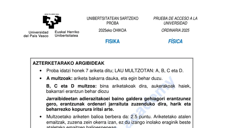 Examen PAU Física selectividad País Vasco — Ordinaria 2025