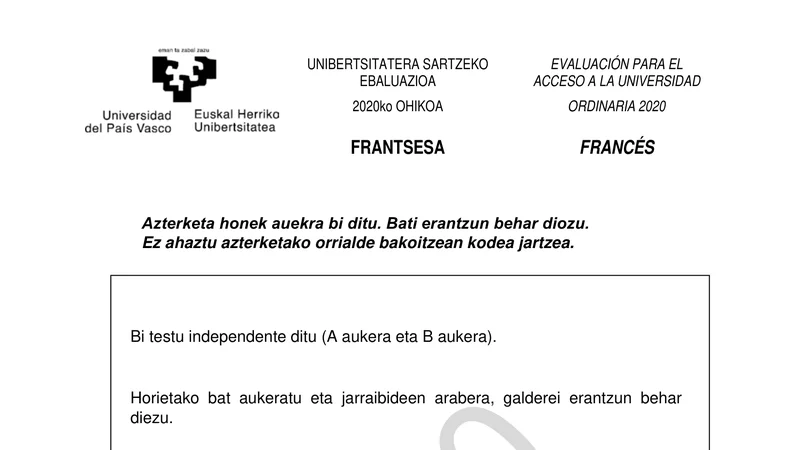 Examen PAU Francés selectividad País Vasco — Ordinaria 2020