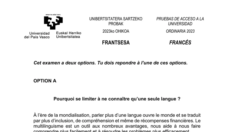 Examen PAU Francés selectividad País Vasco — Ordinaria 2023