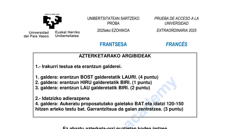 Examen PAU Francés selectividad País Vasco — Extraordinaria 2025
