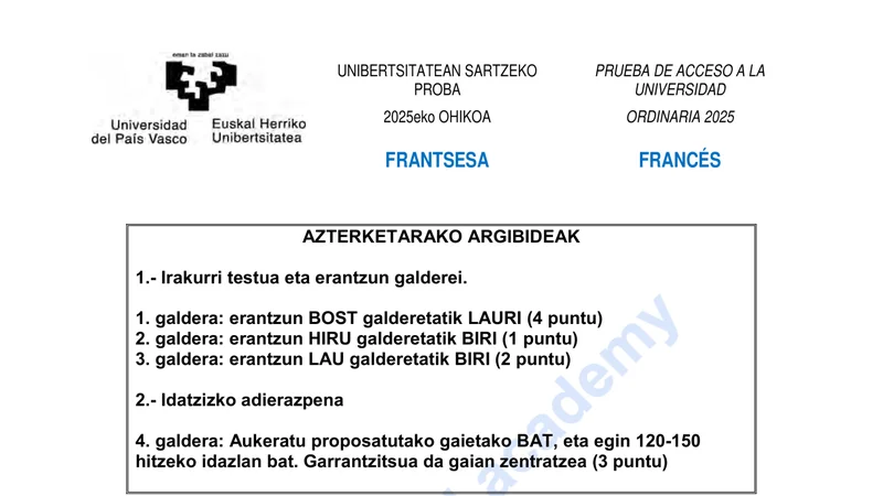Examen PAU Francés selectividad País Vasco — Ordinaria 2025