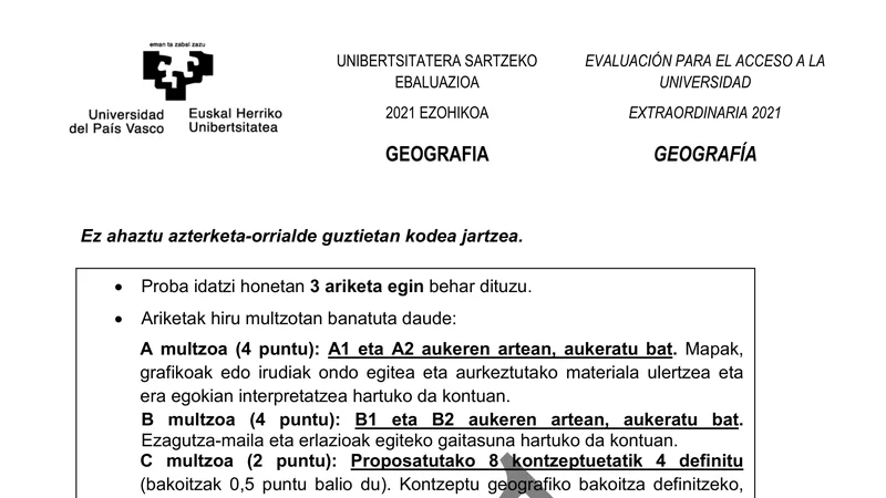 Examen PAU Geografía selectividad País Vasco — Extraordinaria 2021